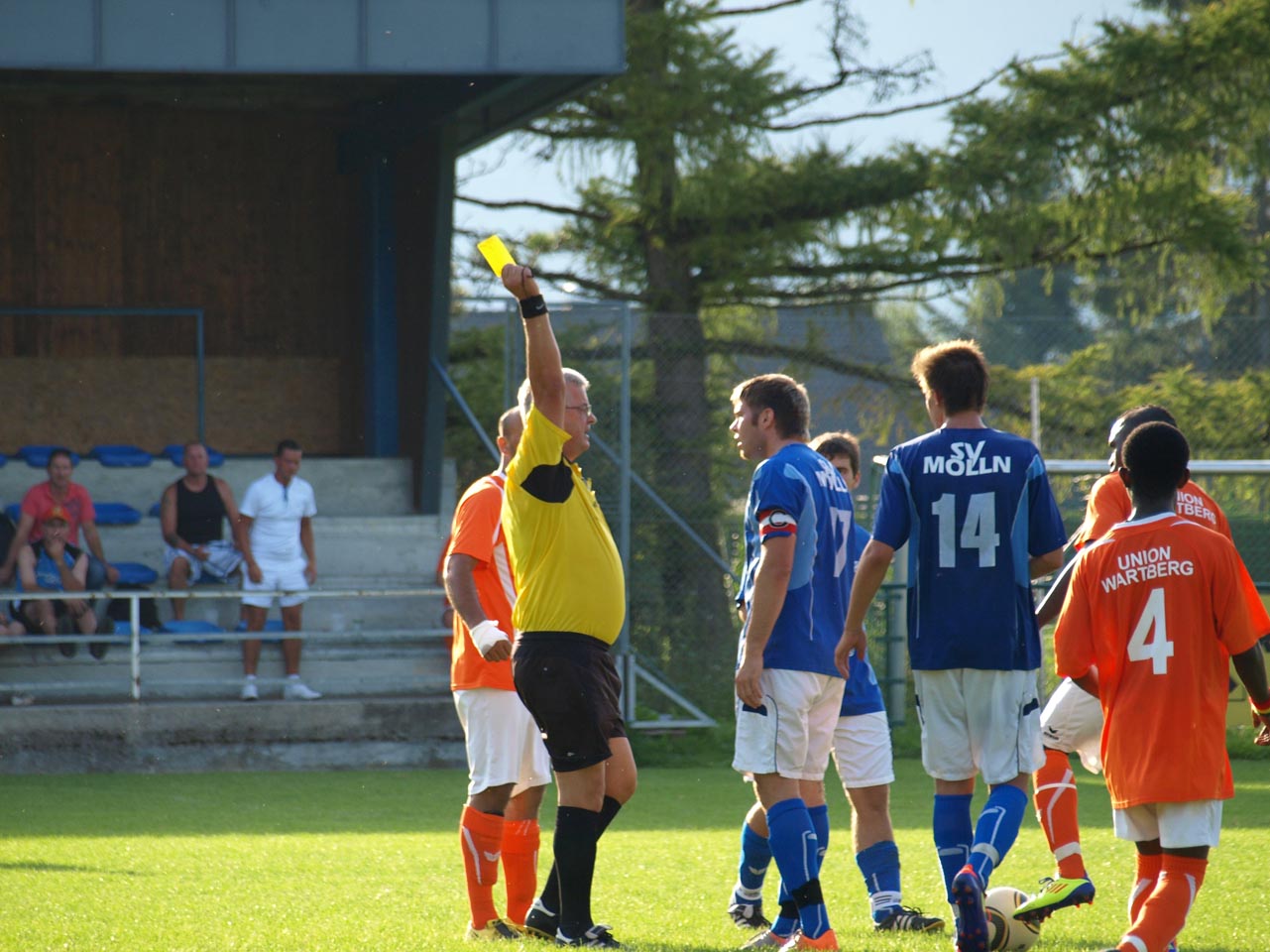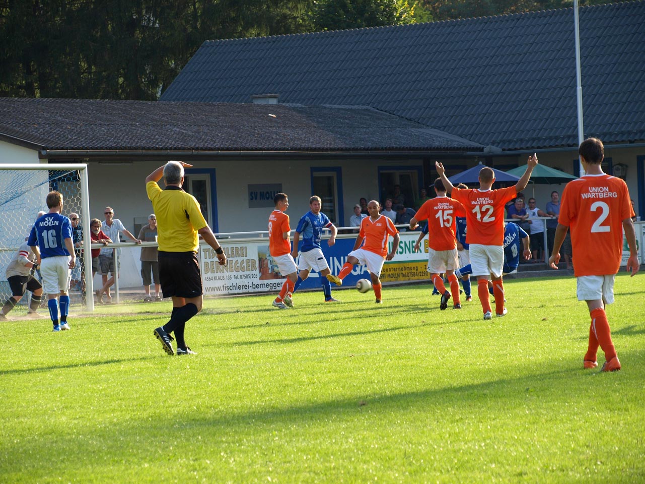 Die Zuseher sahen vom Start weg eine sehr aggressive Heim-Elf welche sofort zeigen wollte wer Herr im Hause ist. Bereits nach wenigen Minuten brachte die Wartberger Hintermannschaft den Ball nicht aus der Gefahrenzone doch mit Mühe und Not konnte ein frühes Verlusttor vermieden werden. Weiter spielten nur die Mollner während sich die Gäste kaum befreien konnten. Die nächste Gelegenheit vergab Stefan Schmidthaler, seinen Nachschuss aus kurzer Distanz konnte Keeper Dominik Gruber jedoch parieren. Nach dieser Anfangsoffensive ging der Schwung etwas verloren und Wartberg hielt besser dagegen Chancen blieben aber vorerst aus. Gegen Ende der ersten Hälfte wurden auch die Gäste gefährlich und hätten beinahe die Führung erzielt. Mario Lindorfer ließ einen Freistoss abprallen reagierte beim Nachschuss allerdings sensationell und hielt somit die Null für sein Team fest. Somit ging es mit dem torlosen Remis in die Kabinen.