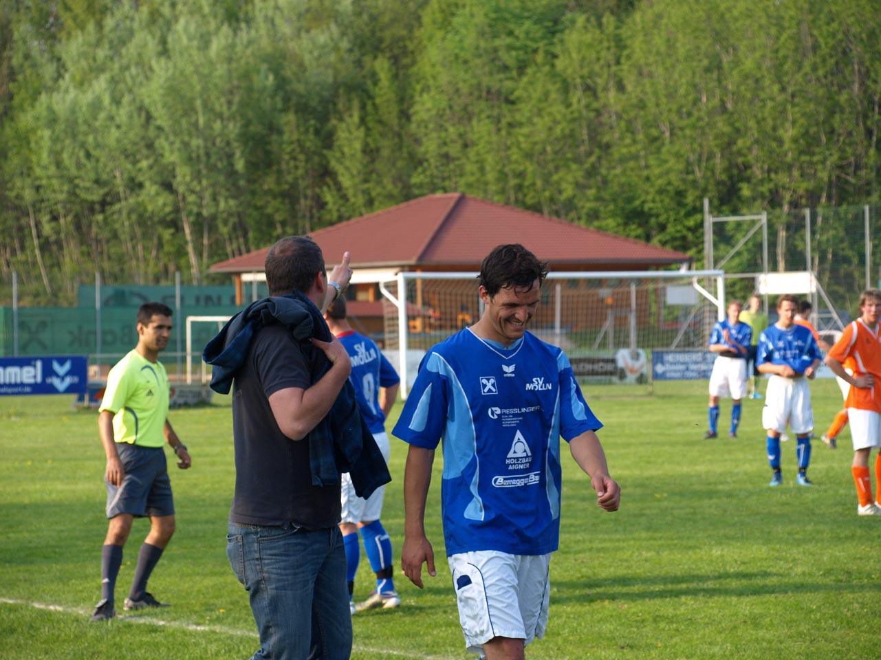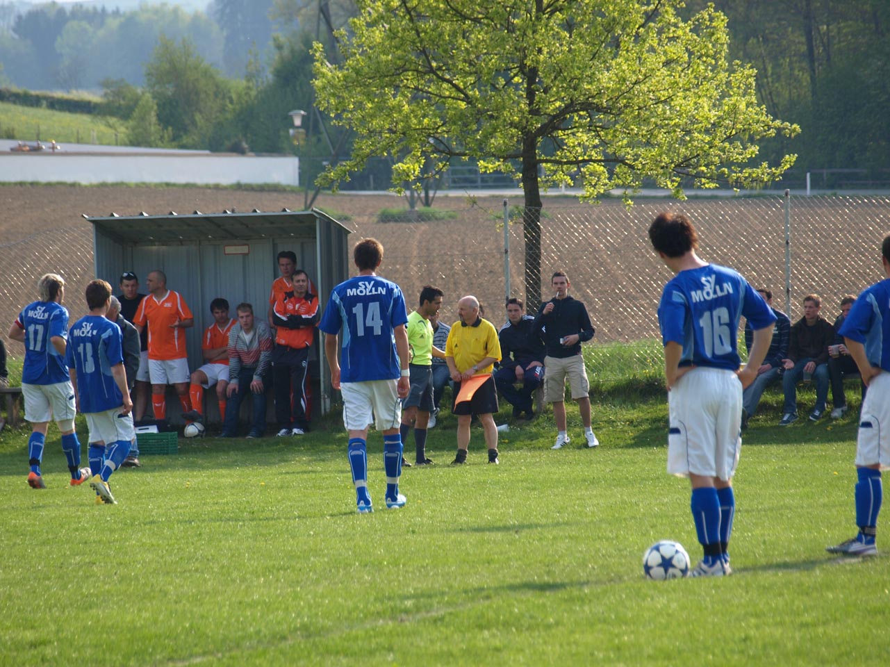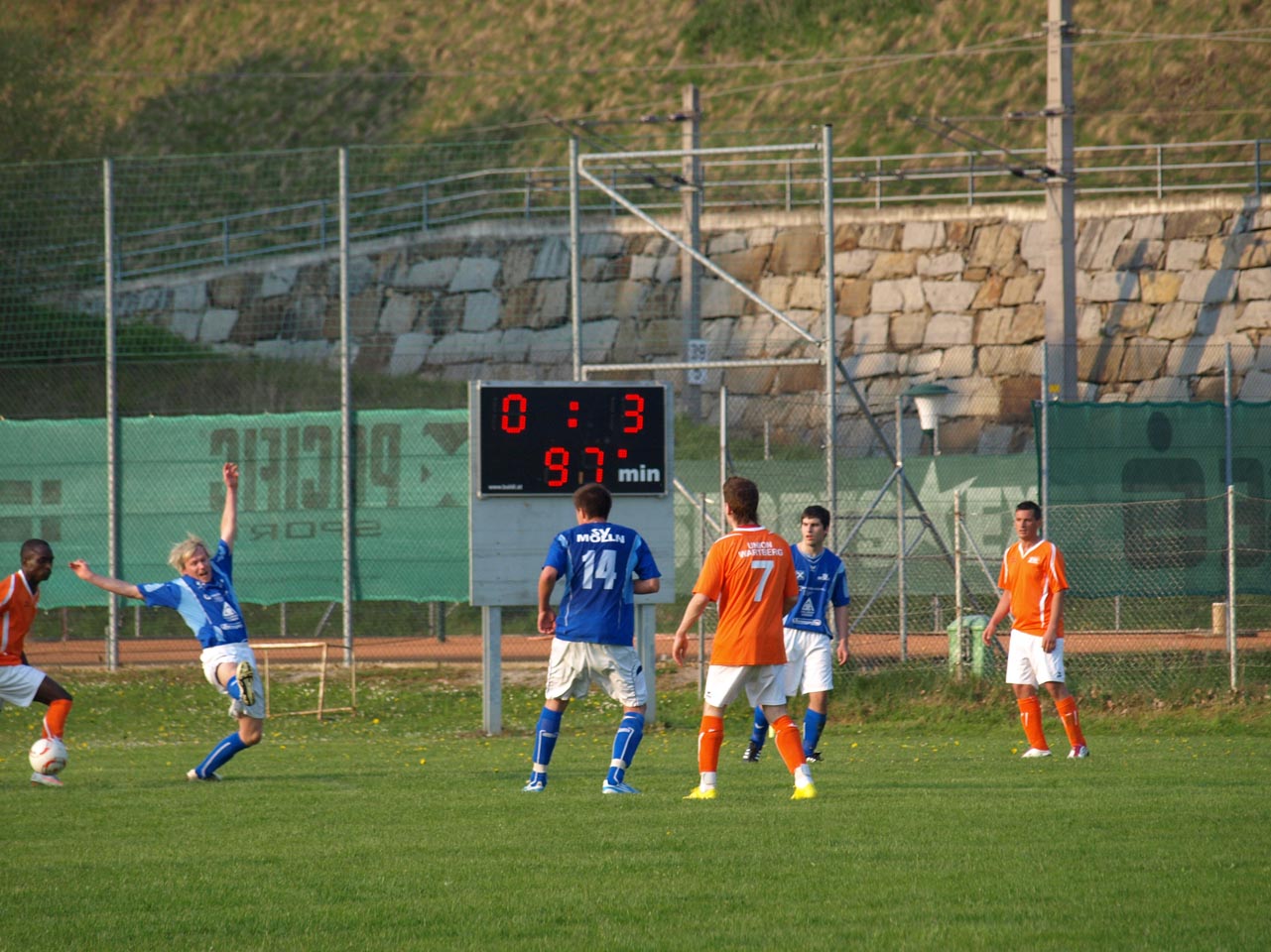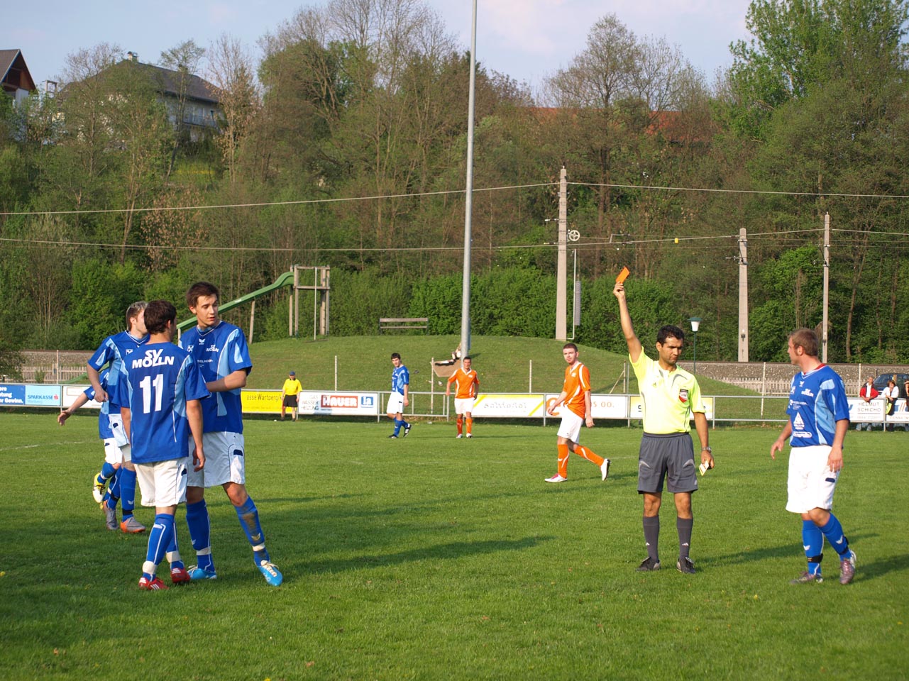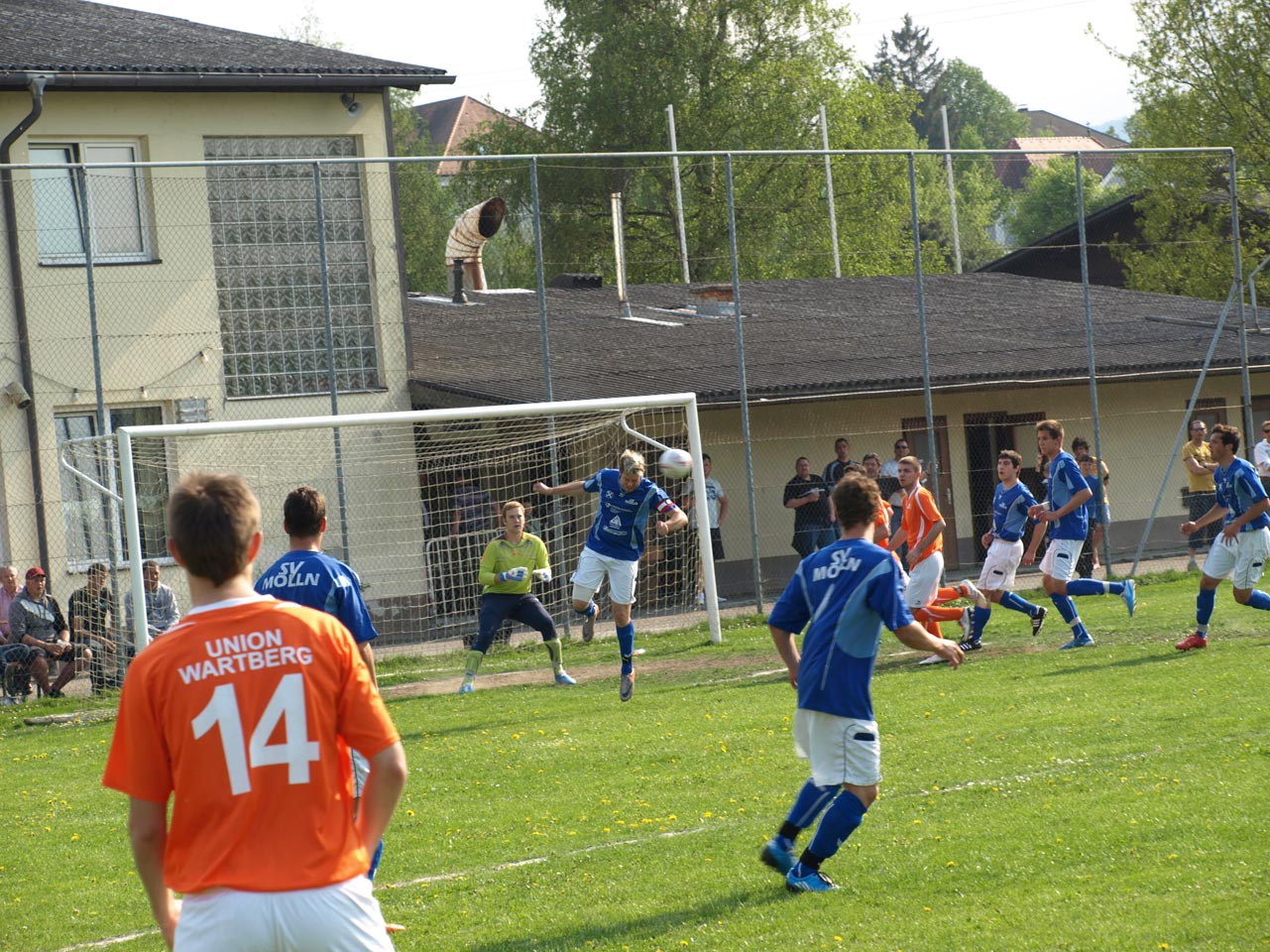 Die Mollner begannen sehr druckvoll und hatten kur nach dem Anpfiff die erste gute Möglichkeit auf die Führung. Martin Laglstorfer hatte die Kugel von der rechten Seite scharf zur Mitte gebracht doch Matthias Rinner konnte diese Vorlage aus guter Position nicht verwerten (2.). Wartberg konnte sich in der Anfangsphase überhaupt nicht befreien und war offensiv fast nicht vorhanden. Eine viertel Stunde war absolviert als Schiedsrichter Zeki nach einem Foul an Stefan Schmidthaler auf den Elfmeterpunkt zeigte - der gefoulte trat selbst an und verwertete sicher zum 1:0 für Molln. In weiterer Folge war das Spiel durch viele Zweikämpfe und Fouls geprägt, so wurden auch die Heimischen durch Standardsituation etwas gefährlicher. Ein direkter Freistoß sreifte die Oberkante der Querlatte, Molln Goalie Patrick Stickler wäre allerdings zur Stelle gewesen. Gegen Ende der ersten Halbzeit ereignete sich die kurioseste Szene der gesamten Partie, bei der der Unparteiische im Mittelpunkt stand. Nach einem hohen Ball in Richtung Mollner Strafraum starteten gleich drei Wartberger Angreifer aus Abseitsposition, welche der heimische Linienrichter auch korrekt anzeigte. Der Schiedsrichter blickte zu seinem Assistenten und ließ zur Verwunderung aller Beteiligten weiterlaufen - Miran Gavric beförderte das Leder anschließend zum vermeintlichen Ausgleich in die Maschen (34.). Aufgrund von zahlreichen Interventionen der Mollner Spieler hielt der Unparteiische schlussendlich doch noch Rücksprache mit dem Linienrichter und annulierte den Treffer folgerichtig. Kurz vor der Pause sorgte der aufgerückte Gerald Kimbacher nach einer Ecke noch einmal für Gefahr im Wartberger Strafraum, Keeper Dominik Gruber parierte seinen Kopfball jedoch sicher.