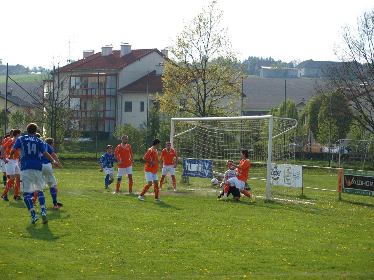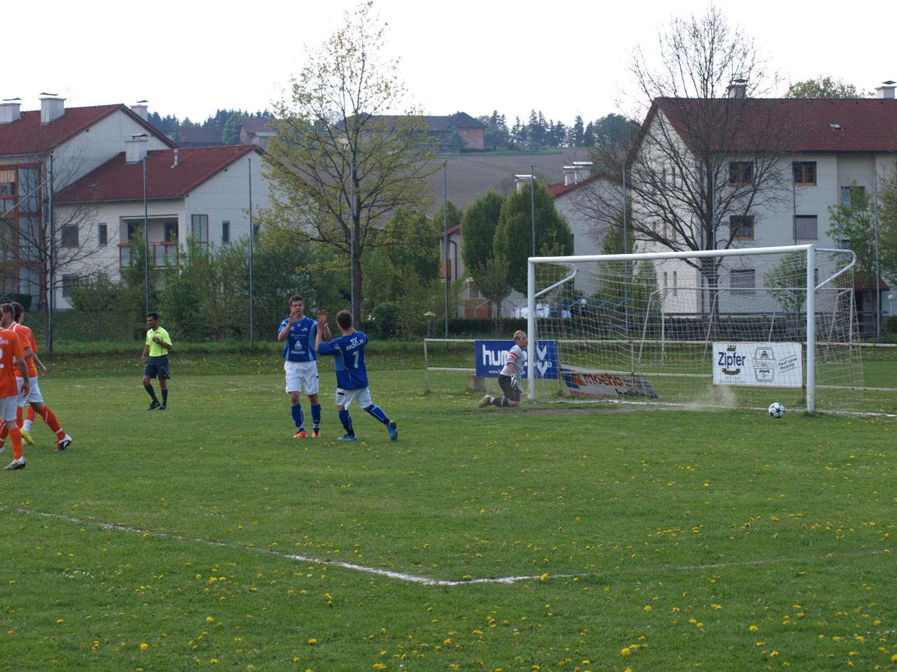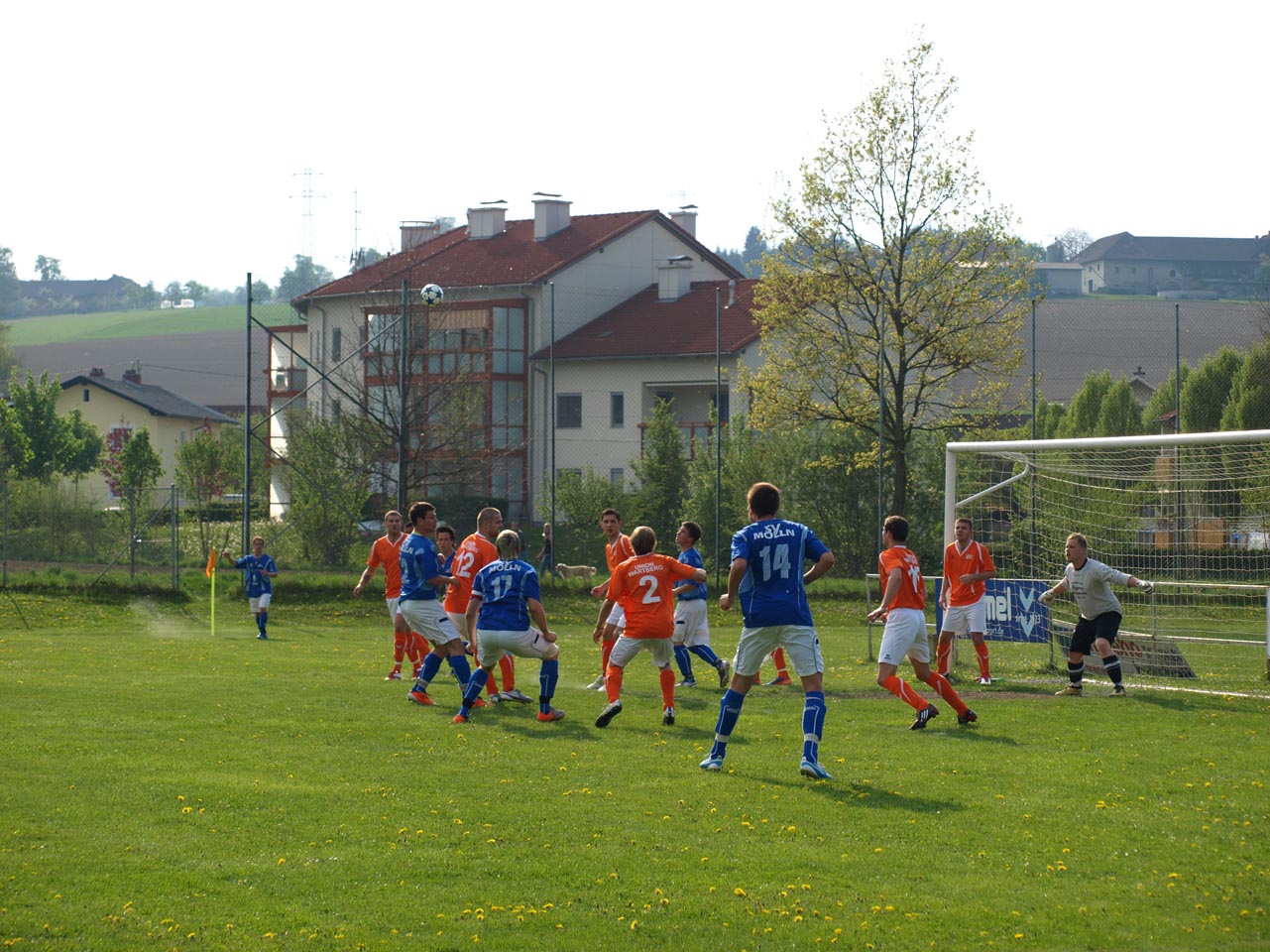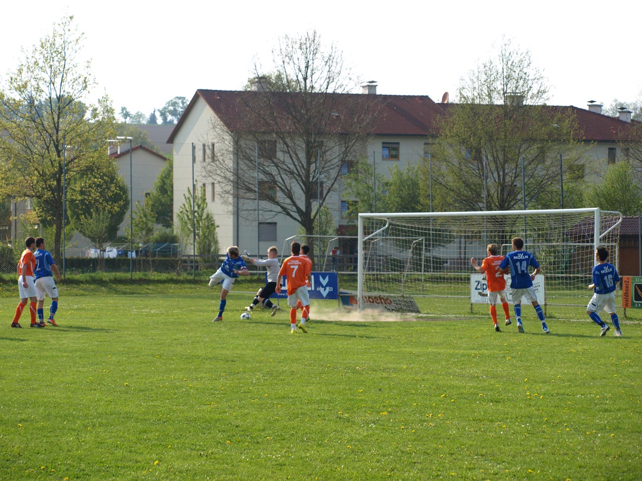 Die Mollner begannen sehr druckvoll und hatten kur nach dem Anpfiff die erste gute Möglichkeit auf die Führung. Martin Laglstorfer hatte die Kugel von der rechten Seite scharf zur Mitte gebracht doch Matthias Rinner konnte diese Vorlage aus guter Position nicht verwerten (2.). Wartberg konnte sich in der Anfangsphase überhaupt nicht befreien und war offensiv fast nicht vorhanden. Eine viertel Stunde war absolviert als Schiedsrichter Zeki nach einem Foul an Stefan Schmidthaler auf den Elfmeterpunkt zeigte - der gefoulte trat selbst an und verwertete sicher zum 1:0 für Molln. In weiterer Folge war das Spiel durch viele Zweikämpfe und Fouls geprägt, so wurden auch die Heimischen durch Standardsituation etwas gefährlicher. Ein direkter Freistoß sreifte die Oberkante der Querlatte, Molln Goalie Patrick Stickler wäre allerdings zur Stelle gewesen. Gegen Ende der ersten Halbzeit ereignete sich die kurioseste Szene der gesamten Partie, bei der der Unparteiische im Mittelpunkt stand. Nach einem hohen Ball in Richtung Mollner Strafraum starteten gleich drei Wartberger Angreifer aus Abseitsposition, welche der heimische Linienrichter auch korrekt anzeigte. Der Schiedsrichter blickte zu seinem Assistenten und ließ zur Verwunderung aller Beteiligten weiterlaufen - Miran Gavric beförderte das Leder anschließend zum vermeintlichen Ausgleich in die Maschen (34.). Aufgrund von zahlreichen Interventionen der Mollner Spieler hielt der Unparteiische schlussendlich doch noch Rücksprache mit dem Linienrichter und annulierte den Treffer folgerichtig. Kurz vor der Pause sorgte der aufgerückte Gerald Kimbacher nach einer Ecke noch einmal für Gefahr im Wartberger Strafraum, Keeper Dominik Gruber parierte seinen Kopfball jedoch sicher.
